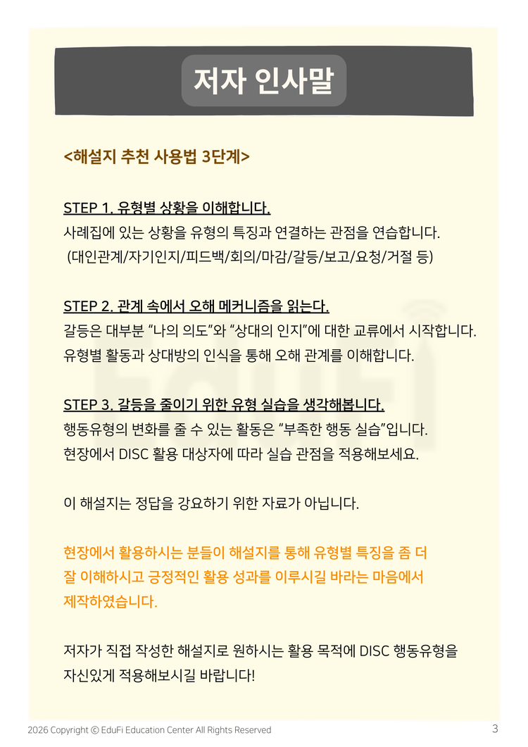 저자가 직접 작성한 해설지로 원하시는 활용 목적에 DISC 행동유형을 자신있게 적용해보시길 바랍니다!