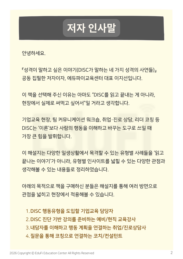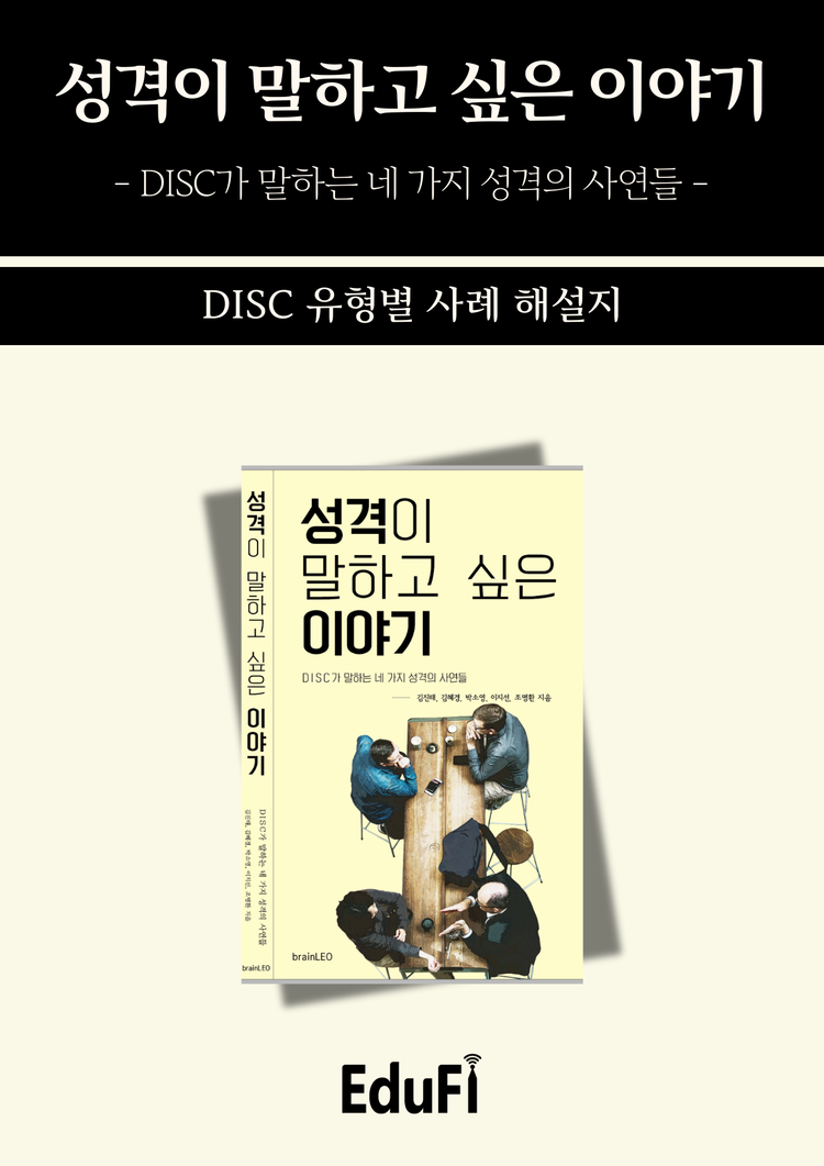 <성격이 말하고 싶은 이야기 (DISC가 말하는 네 가지 사연들)>는 DISC 행동유형에 대해 조금 더 쉽게 이해할 수 있는 일상생활 속 사례들을 담고 있습니다. 4가지 행동유형별 사례들을 20개씩 총 80개로 다양한 관점에 대해 생각해볼 수 있도록 전달합니다.